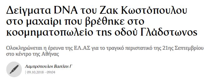 Η ΕΛΑΣ μέσω του Βασίλη Λαμπρόπουλου στην εφημερίδα «Το βήμα» δήλωσε ότι στο μαχαίρι βρέθηκε DNA του Ζακ. Σύμφωνα όμως την έκθεση της διεύθυνσης εγκληματολογικών ερευνών της αστυνομίας, το DNA που βρέθηκε ήταν από το αίμα του Ζακ ενώ δεν υπήρχαν αποτυπώματά του.